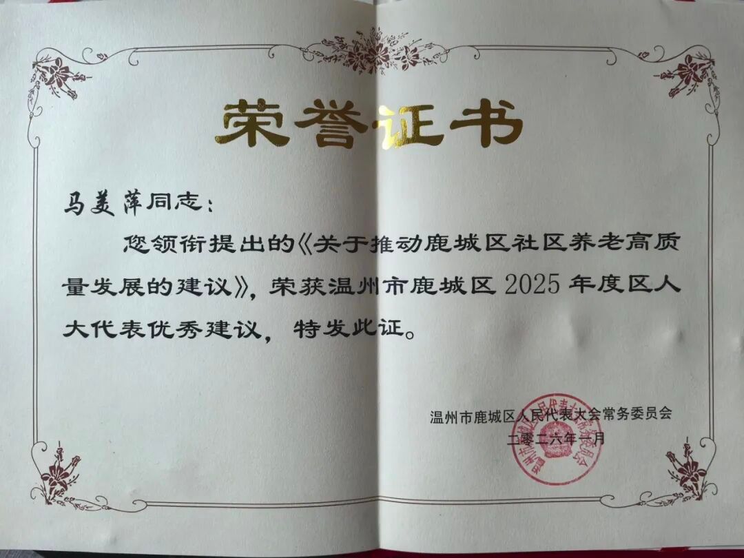 近日,鹿城区人大代表、皇冠娱乐城 环境卫生与毒理学系马美萍副教授提出的《关于推动鹿城区社区养老高质量发展的若干建议》,荣获“2025年度鹿城区人大代表优秀建议”称号。