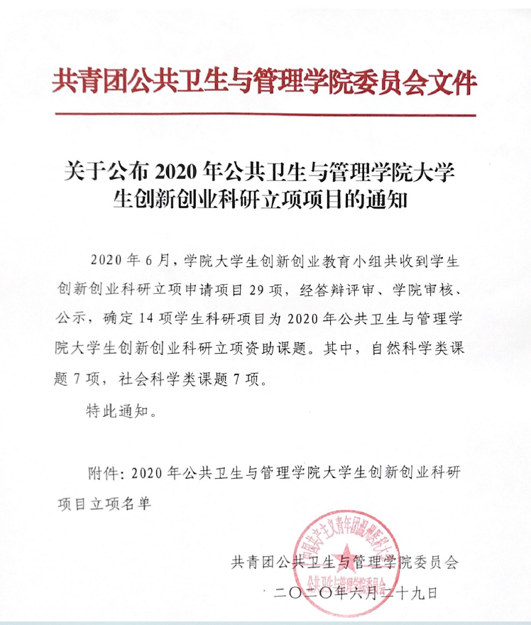 关于公布2020年公共卫生与管理皇冠娱乐城 大学生创新创业科研立项项目的通知